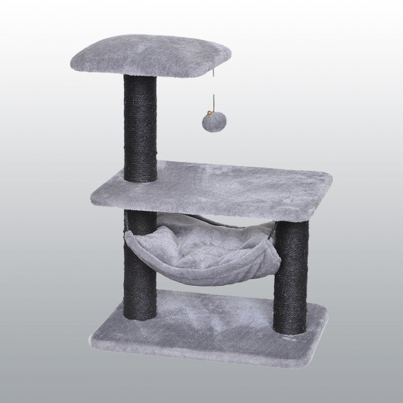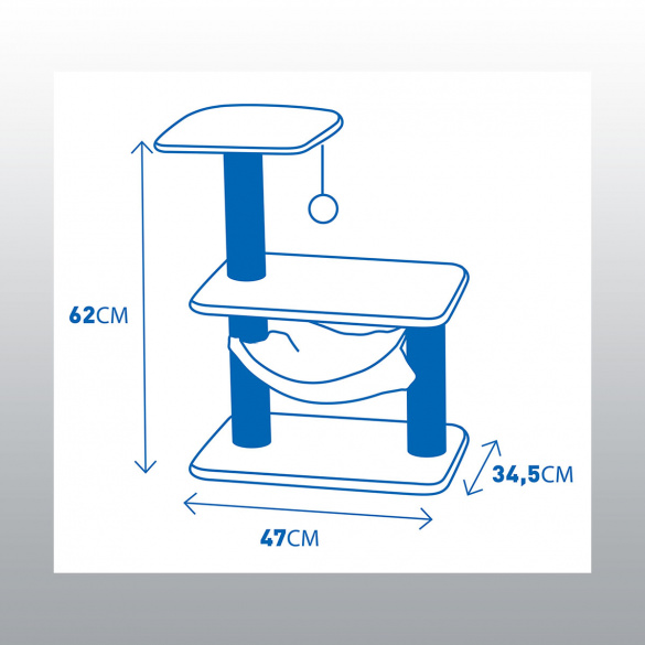 Avec hamac et balle de jeu.Peluche et sisal de qualité.Couleur : gris.Dimensions : 47 x 34,5 x 62 cm.