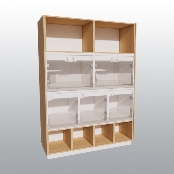 - 3 cages -24 h Curve Silver, 2 cages + 24 h Silver avec joues latérales de finition, rangements bas ouverts, rangements hauts ouverts.