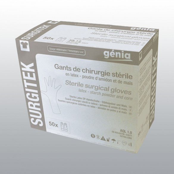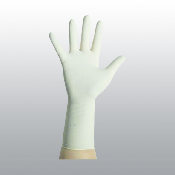 Gants de chirurgie stériles, anatomiques à manchettes longues, en latex pré-poudrés.