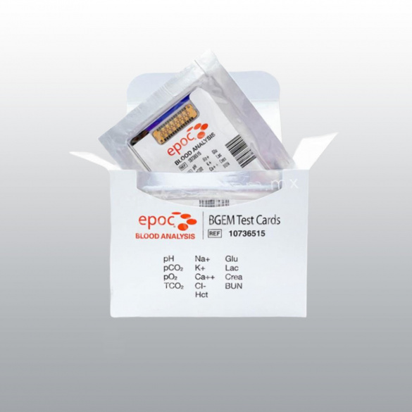 11 analytes sur 1 carte d'analyse : pH, pCO2, pO2, Na+, K+, Ca++, Glu, Hct, Lactates, Créa, CL, BUN, TCO2.